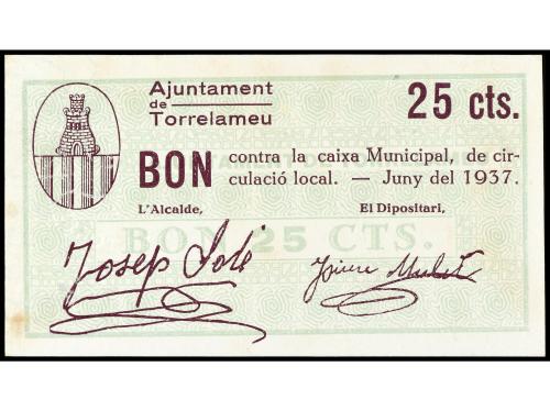 CATALUNYA. Lote 2 billetes 10 y 25 Cèntims. Aj. de TORRELAMEU. AT-2549, 2550. MBC+ a EBC-.