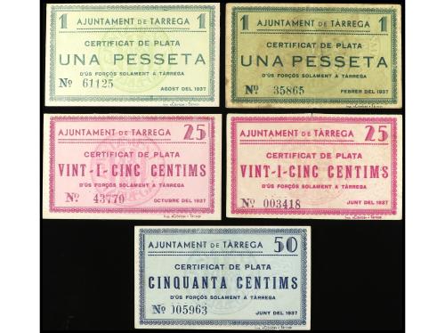 CATALUNYA. Lote 5 billetes 25 (2) y 50 Cèntims y 1 Pesseta. Febrer, Juny, Agost y Octubre 1937. Aj. de TARREGA. AT-2441, 2442, 2443, 2444, 2445. MBC a EBC-.