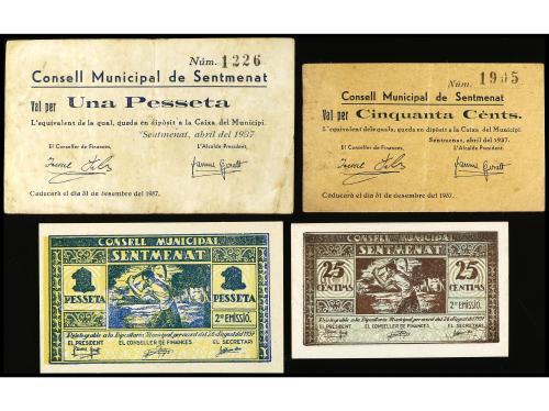 CATALUNYA. Lote 4 billetes 25 y 50 Cèntims y 1 Pesseta (2). Abril y Agost 1937. Aj. de SENTMENAT. AT-2340, 2341, 2342e, 2343d. MBC a EBC-.