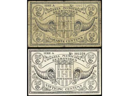 CATALUNYA. Lote 2 billetes 25 y 50 Cèntims. 22 Abril 1937. C.M de SESROVIRES. (50 Cèntims roturas). MUY ESCASOS. AT-2368b, 2369a. BC+ y MBC+.