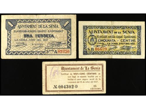 CATALUNYA. Lote 3 billetes 25, 50 Cèntims y 1 Pesseta. Juny y Juliol 1937. Aj. de LA SÉNIA. (Algo sucios). AT-2330/2332. MBC.
