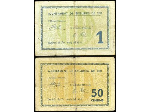CATALUNYA. Lote 2 billetes 50 Cèntims y 1 Pesseta. Maig 1937. Aj. de SEGURÍES DE TER. (Roturas). AT-2311, 2312. MBC-.