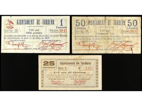 CATALUNYA. Lote 3 billetes 25, 50 Cèntims y 1 Pesseta. 8 Setembre 1937. Aj. de TORDERA. (Uno con roturas). AT-2510/2512. BC+ a MBC+.