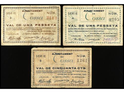CATALUNYA. Lote de 3 billetes de 50 Cèntims y 1 Pesseta (2). 31 Maig 1937. Aj. de TOSSA. (Roturas). AT-2584, 2585, 2586. MBC-.