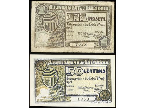 CATALUNYA. Lote 2 billetes 50 Cèntims y 1 Pesseta. Aj. de TARADELL. AT-2432/2433. MBC- y MBC+.