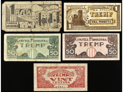 CATALUNYA. Lote 5 billetes 20, 50 Cèntims (2) y 1 Pesseta (2). C.M. de TREMP. A EXAMINAR. BC+ a MBC+.