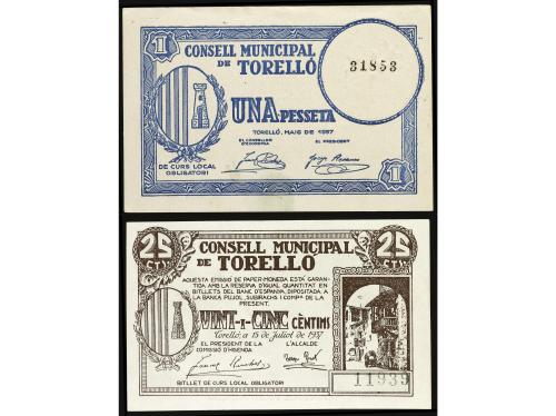 CATALUNYA. Lote 2 billetes 25 Cèntims y 1 Pesseta. Maig i Juliol 1937. C.M. de TORELLÓ. AT-2513, 2514. EBC- a EBC.