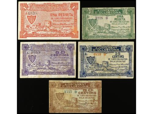 CATALUNYA. Lote 5 billetes de 25, 50 Cèntims (2) y 1 Pesseta (2). Març y Setembre 1937. Aj. d´ ULLDECONA. AT-2611/15. MBC- a MBC+.