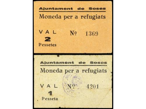 CATALUNYA. Lote 2 billetes 1 y 2 Pesssetes. Aj. de SOSES. MONEDA PER A REFUGIATS. AT-2405, 2406. MBC a EBC-.