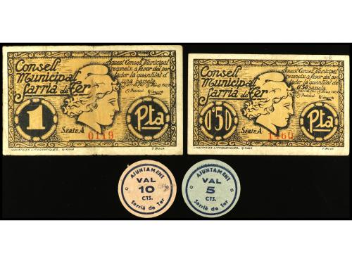 CATALUNYA. Lote 4 billetes 5 y 10 Cèntims y 0,50 y 1 Pesseta. C.M y Aj. de SARRIÀ DE TER. AT-2291, 2292, 2297, 2298. MBC a EBC.