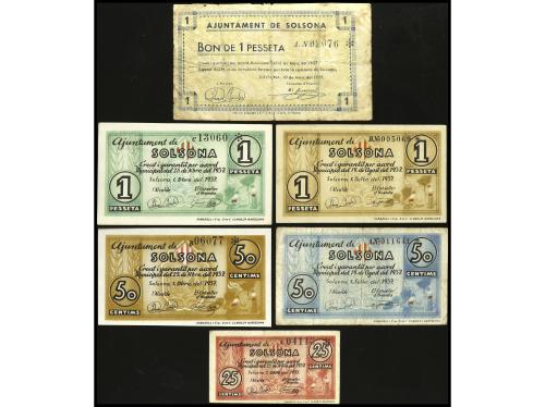 CATALUNYA. Lote 6 billetes 25 Cèntims a 1 Pesseta. 1937. Aj. de SOLSONA. Todos diferentes. A EXAMINAR. BC+ a MBC+.