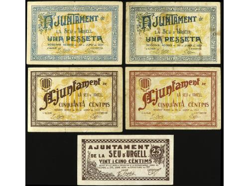 CATALUNYA. Lote 5 billetes 25, 50, Cèntims (2) y 1 Pesseta (2). 30 Juny y 23 Octubre 1937. Aj. de LA SEU D´ URGELL. AT-2370, 2371, 2372, 2373, 2374. MBC- a MBC.