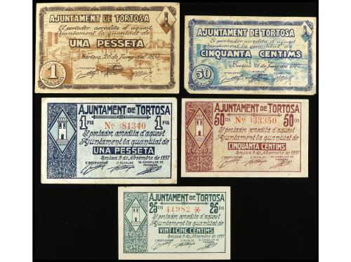 CATALUNYA. Lote 5 billetes 25 y 50 Cèntims (2) y 1 Pesseta (2). Juny y Novembre 1937. Aj. De TORTOSA. AT-2578/79, 2580/82. MBC a MBC+.
