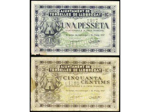 CATALUNYA. Lote 2 billetes 50 Cèntims y 1 Pesseta. 10 Maig 1937. Aj. de TORRELLES DE LLOBREGAT. AT-2555a, 2556b. MBC a MBC+.