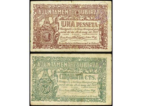CATALUNYA. Lote 2 billetes 50 Cèntims y 1 Pesseta. 16 Maig 1937. Aj. de SUBIRATS. (Leves roturas). AT-2408, 2409. MBC-.