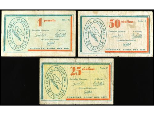 CATALUNYA. Lote 3 billetes 25, 50 Cèntims y 1 Pesseta. Agost 1937. C.M. de TORTELLA. AT-2575/77. MBC- a MBC.
