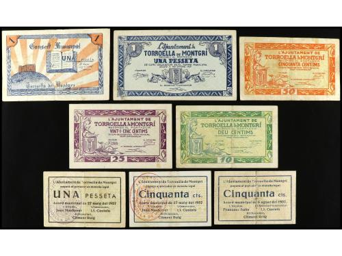 CATALUNYA. Lote 8 billetes 10 Cèntims a 1 Pesseta. C.M. y Aj. de TORROELLA DE MONTGRÍ. A EXAMINAR. AT-2562/2569. MBC+.