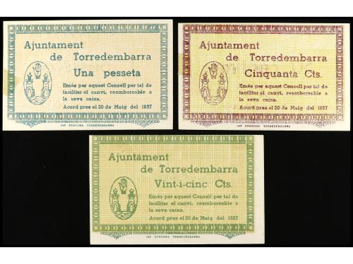 CATALUNYA. Lote 3 billetes 25, 50 Cèntims y 1 Pesseta. 20 Maig 1937. Aj. de TORREDEMBARRA. (Restos de adhesivo). AT-2540, 2541, 2542. EBC-.