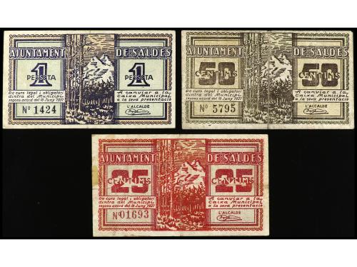 CATALUNYA. Lote 3 billetes 25, 50 Cèntims y 1 Pesseta. 10 Juny 1937. Aj. de SALDES. AT-2253/55. MBC a MBC+.