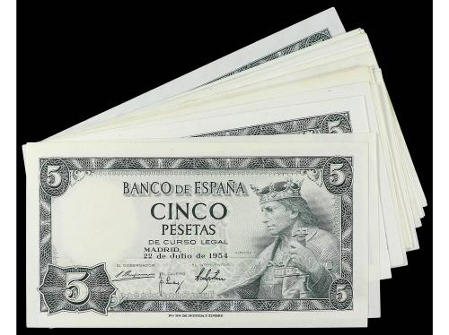 ESTADO ESPAÑOL. Lote 22 billetes 5 Pesetas. 22 Julio 1954. Alfonso X. Sin serie y Serie A, B, C, D, E, F, G, H, I, J, K, L, M, N, P, Q, R, S, T, U, V. Ed-466, 466a. EBC- a SC-.