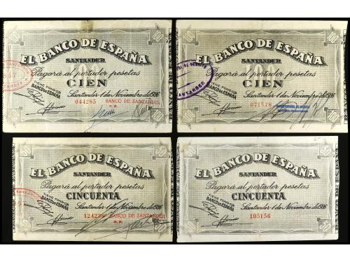 GUERRA CIVIL, ZONA REPUBLICANA. Lote 4 billetes 50 (2) y 100 Pesetas (2). 1 Noviembre 1936. BANCO DE ESPAÑA. SANTANDER. (Uno reparado con adhesivo). MBC- a MBC+.