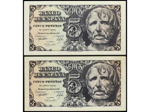 ESTADO ESPAÑOL. Lote 2 billetes 5 Pesetas. 12 Abril 1947. Séneca. Sin serie. Ed-454. MBC+.