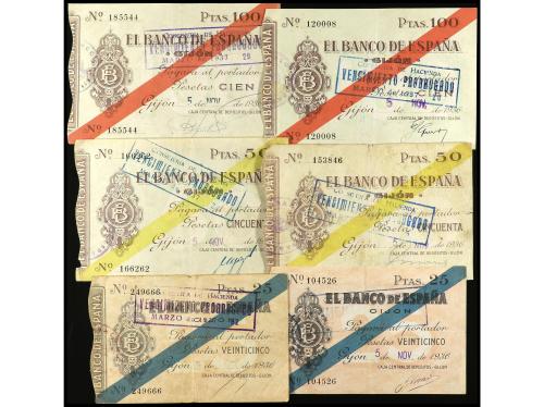 GUERRA CIVIL, ZONA REPUBLICANA. Lote 6 billetes 25 (2), 50 (2) y 100 Pesetas (2). 1936. EL BANCO DE ESPAÑA. GIJÓN. Ed-382, 383, 384. MBC- a MBC+.