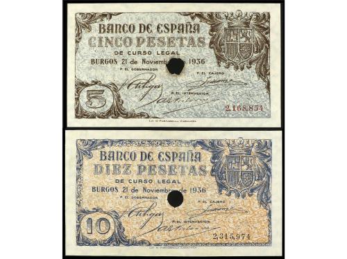ESTADO ESPAÑOL. Lote 2 billetes 5 y 10 Pesetas. 21 Noviembre 1936. Con taladros de cancelación. (Puntos de grapa). Ed-417T y 418T. EBC.