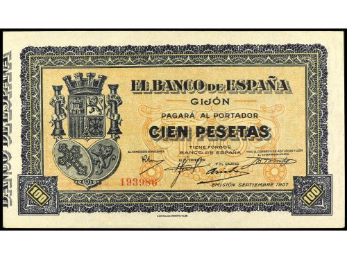 GUERRA CIVIL, ZONA REPUBLICANA. 100 Pesetas. Septiembre 1937. EL BANCO DE ESPAÑA. GIJÓN. Ed-399. SC.