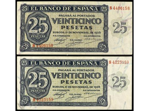 ESTADO ESPAÑOL. Lote 2 billetes 25 Pesetas. 21 Noviembre 1936. Serie S. Ed-419b. MBC+ y EBC-.