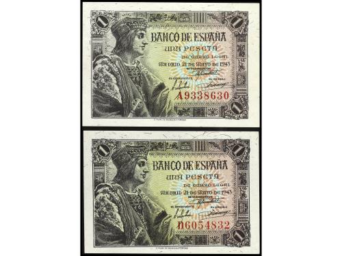 ESTADO ESPAÑOL. Lote 2 billetes 1 Peseta. 21 Mayo 1943. Fernando El Católico. Serie A y D. (Arruguita). Ed-447a. SC-.