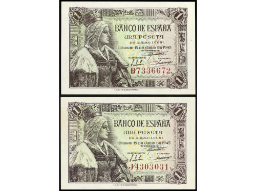 ESTADO ESPAÑOL. Lote 2 billetes 1 Peseta. 15 Junio 1945. Isabel la Católica. Serie B y J. Ed-448a. SC-.