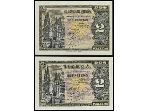 ESTADO ESPAÑOL. Lote 2 billetes 2 Pesetas. 30 Abril 1938. Catedral de Burgos. Serie D y N. Ed-429a, 429b. SC-.