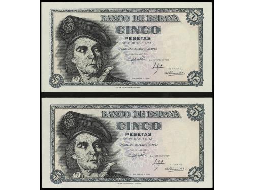 ESTADO ESPAÑOL. Lote 2 billetes 5 Pesetas. 15 Marzo 1948. Elcano. Serie E. Pareja correlativa. Ed-455a. SC-.