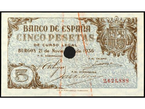 ESTADO ESPAÑOL. 5 Pesetas. 21 Noviembre 1936. Con taladro central. (Perforaciones de grapa y manchitas de tinta roja). Ed-417T. SC-.