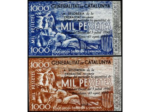 GUERRA CIVIL, ZONA REPUBLICANA. Lote 4 Pruebas de Imprenta 1.000 Pessetes. 10 Agost 1950. GENERALITAT DE CATALUNYA. Anverso Azul, Marrón, naranja y verde. Reverso sólo impresas algunas partes de texto. Ed-Cita pág.106; LB-Cita pág.756. SC- a SC.