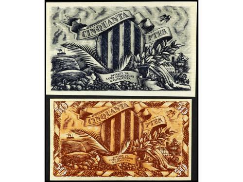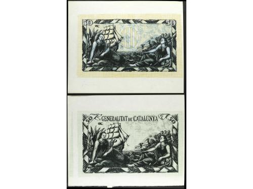 GUERRA CIVIL, ZONA REPUBLICANA. Lote 2 Pruebas de Imprenta 50 pesetas. (1936-1937). GENERALITAT DE CATALUNYA. Prueba de impresión de anverso y reverso para un billete no emitido, en diversas tonalidades. SC- a SC.