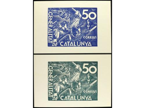 GUERRA CIVIL, ZONA REPUBLICANA. Lote 2 Pruebas de Imprenta 50 Cèntims. (1936-1937). GENERALITAT DE CATALUNYA. Prueba de impresión para correos colores verde y azul. SC.