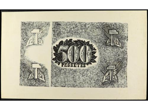 GUERRA CIVIL, ZONA REPUBLICANA. Lote 2 Pruebas de Imprenta 500 Pessetes. (1936-1937). GENERALITAT DE CATALUNYA. Prueba de reverso en color gris y negro de un billete no adoptado. (Leves manchitas del tiempo). SC- a SC.