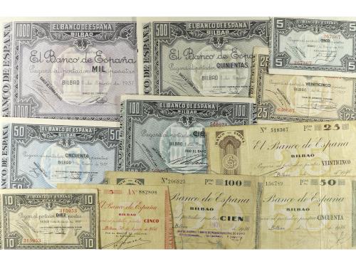 GUERRA CIVIL, ZONA REPUBLICANA. Lote 11 billetes 5 (2), 10, 25 (2), 50 (2), 100 (2), 500, 1.000 Pesetas. 1936 y 1937. EL BANCO DE ESPAÑA. BILBAO. Diferentes antefirmas 50, 500 y 1.000 Pesetas sin matriz y sin numeración. A EXAMINAR. MBC- a SC.