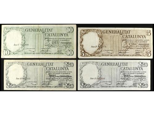 GUERRA CIVIL, ZONA REPUBLICANA. Serie 4 billetes 2, 50 (2), 5 y 10 Pessetes. 21 Setembre 1936. GENERALITAT DE CATALUNYA. 2, 50 Pessetes con numeración roja y negra. Ed-372, 372a, 373, 374. MBC a MBC+.