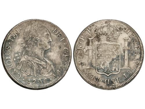 CARLOS IV. 8 Reales. 1796. POTOSÍ. P.P. 26,64 grs. (Pequeñas rayitas). Pátina negra irregular. AC-1000. MBC.