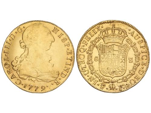 CARLOS III. 8 Escudos. 1779. POTOSÍ. P.R. 26,75 grs. (Sirvió de joya). RARA. AC- 2062 / XC-828. MBC-/MBC.