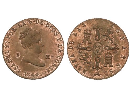 ISABEL II. 2 Maravedís. 1844. SEGOVIA. 2,35 grs. Parte de color y brillo. AC-56. SC-.