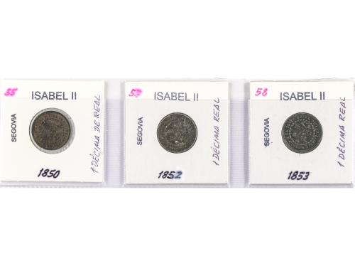 ISABEL II. Lote 3 monedas 1 Décima de Real. 1850, 52 y 53. SEGOVIA. (La de 52 con oxidaciones). AC- 141, 144, 146. MBC+ a MBC- .