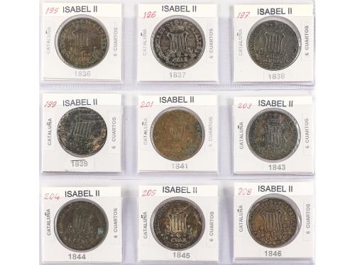 ISABEL II. Lote 9 monedas 6 Cuartos. 1836 a 1846. BARCELONA. Todas diferentes. A EXAMINAR. MBC- a MBC+.