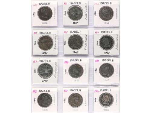 ISABEL II. Lote 12 monedas 8 Maravedís. 1836 a 1850. JUBIA. AC-103/105, 108/110, 112/117. BC+ a BC-.