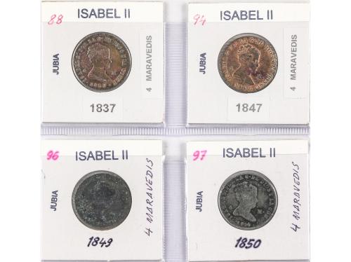 ISABEL II. Lote 4 monedas 4 Maravedís. 1837 a 1850. JUBIA. Todas diferentes. A EXAMINAR. AC-67, 73, 75, 76. BC- a EBC.