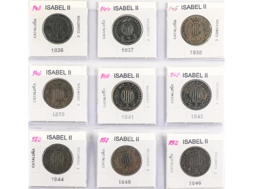 ISABEL II. Lote 9 monedas 3 Cuartos. 1836 a 1846. BARCELONA. Todas diferentes. A EXAMINAR. MBC- a MBC+.