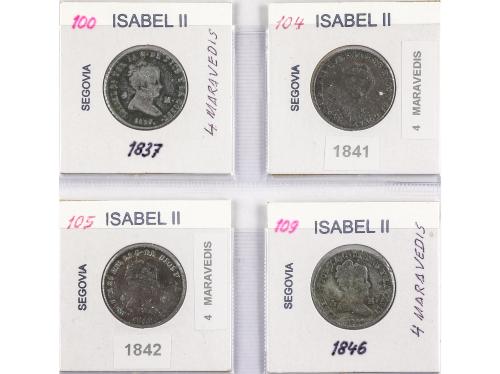 ISABEL II. Lote 4 monedas 4 Maravedís. 1837 a 1846. SEGOVIA. Todas diferentes. A EXAMINAR. AC- 80, 84, 85, 89. BC a MBC-.